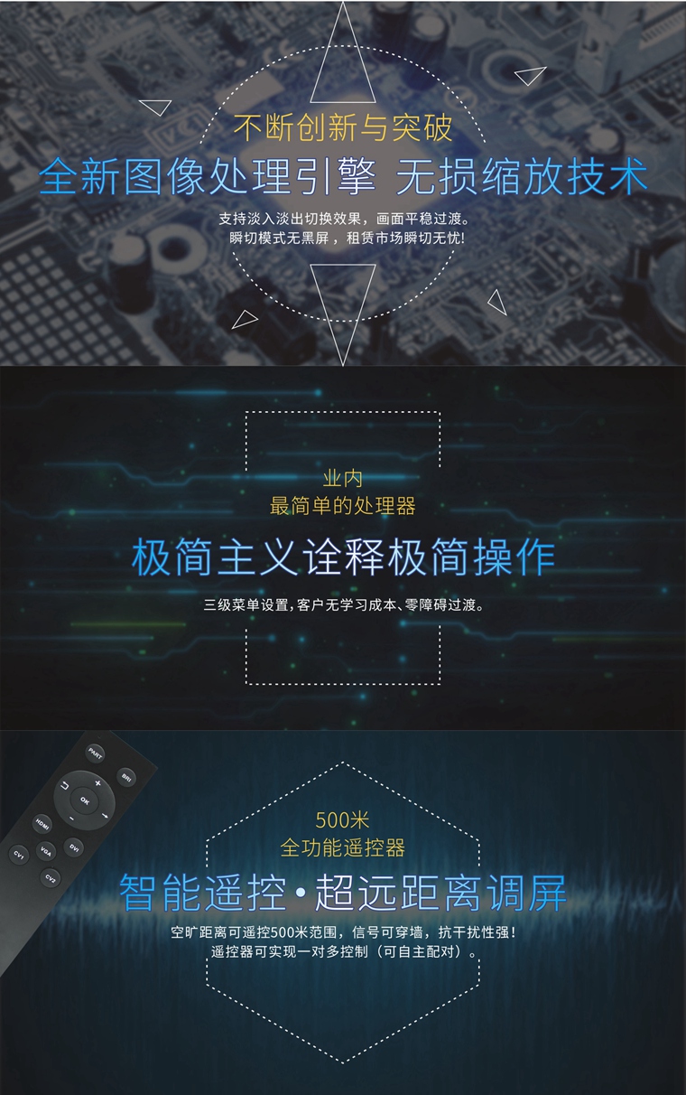 8) 支持淡入淡出,瞬切無(wú)黑屏:⒈支持淡入淡出切換效果,畫(huà)面平穩(wěn)過(guò)渡。⒉瞬切模式無(wú)黑屏 ,租賃市場(chǎng)瞬切無(wú)憂!