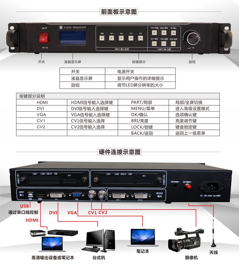 7) 智能鎖鍵:⒈菜單鎖模式:僅開(kāi)放信源切換按鈕,處理器參數(shù)不可調(diào),防止客戶誤操作導(dǎo)致處理器參數(shù)錯(cuò)亂。⒉全鍵鎖模式:鎖定所有按鈕,防止誤觸 。
