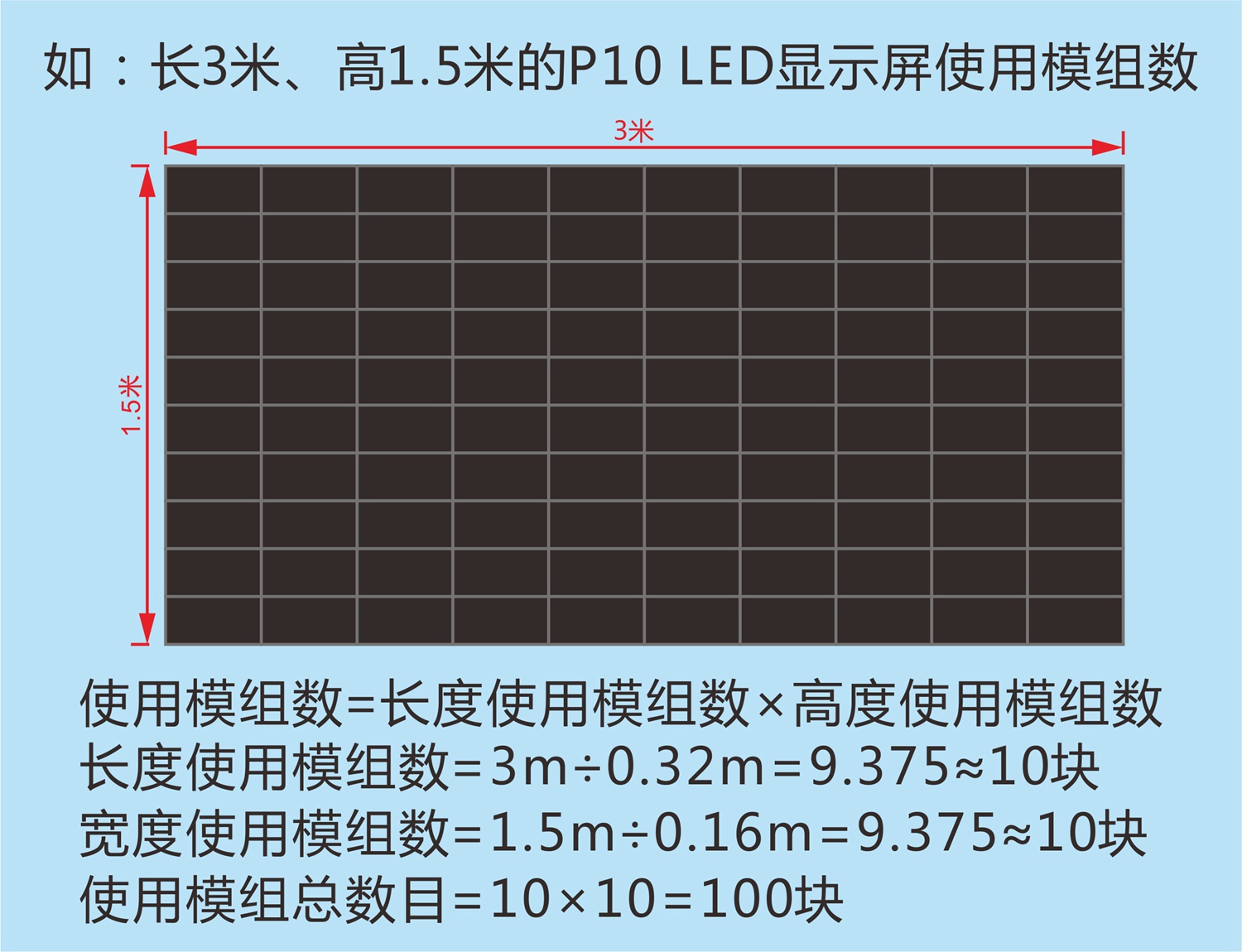 1、計(jì)算方法:使用模組數(shù)=總面積÷模組長(zhǎng)度÷模組高度