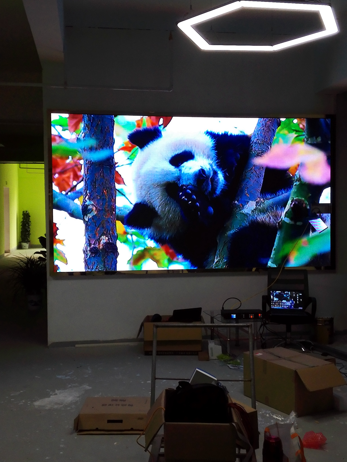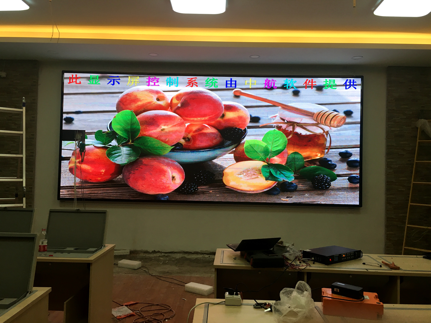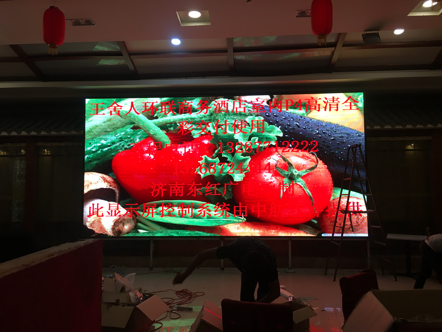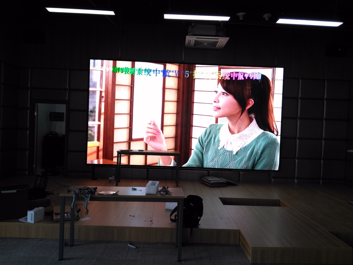安徽省合肥市某飯店,P2.5總點數960*704,8張接收卡,一張發(fā)送卡,單卡最大帶載128*704。感謝安徽荊涂光電孫總對中航的信任與支持!