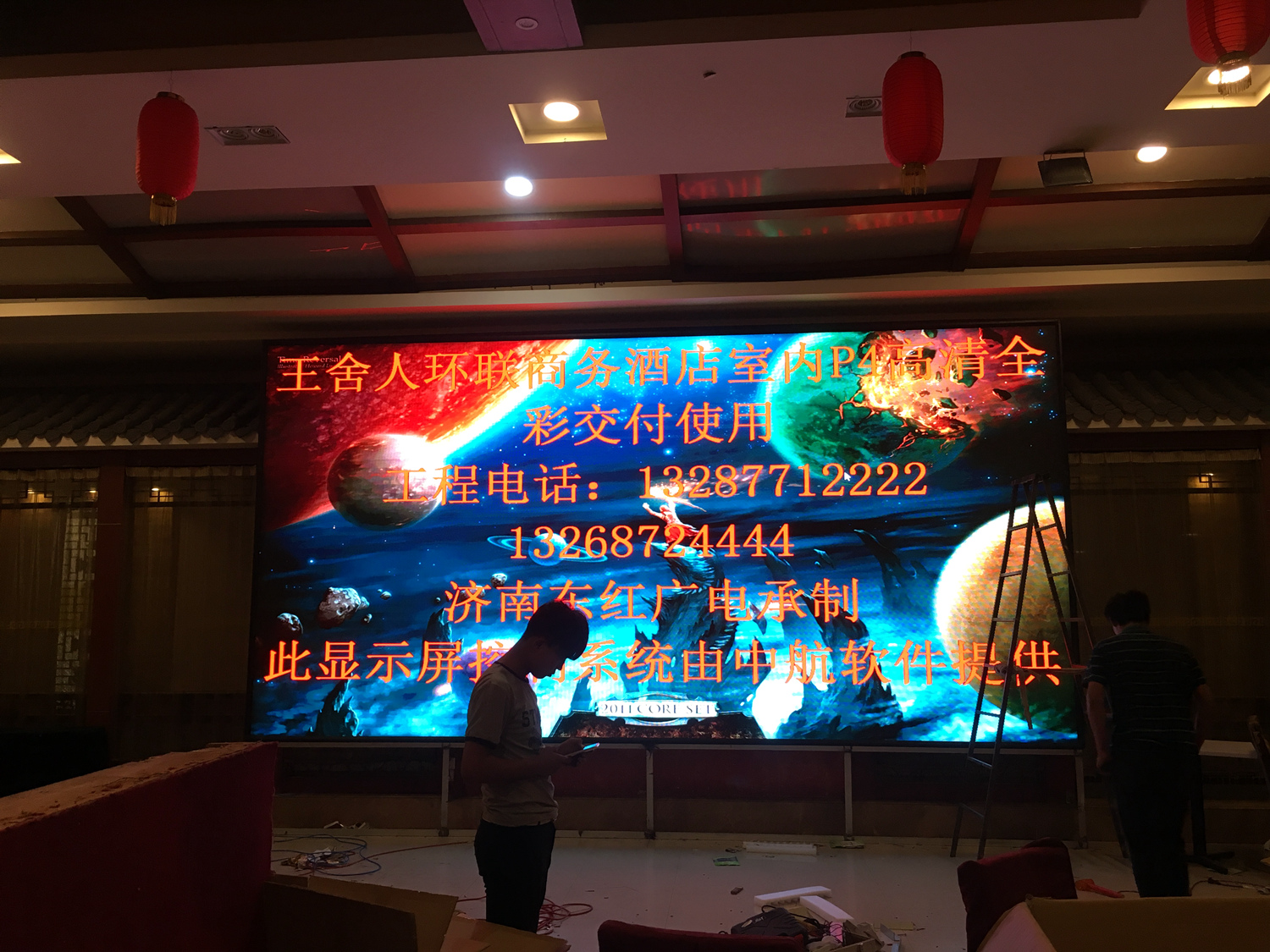 山東省濟南市環(huán)聯商務酒店 室內P4 ,總點數1472×736,1張發(fā)送卡,10張接收卡完美帶載!單卡最大帶載320×384,感謝濟南東紅光電徐總對中航的信任和認可,我們會更加努力!