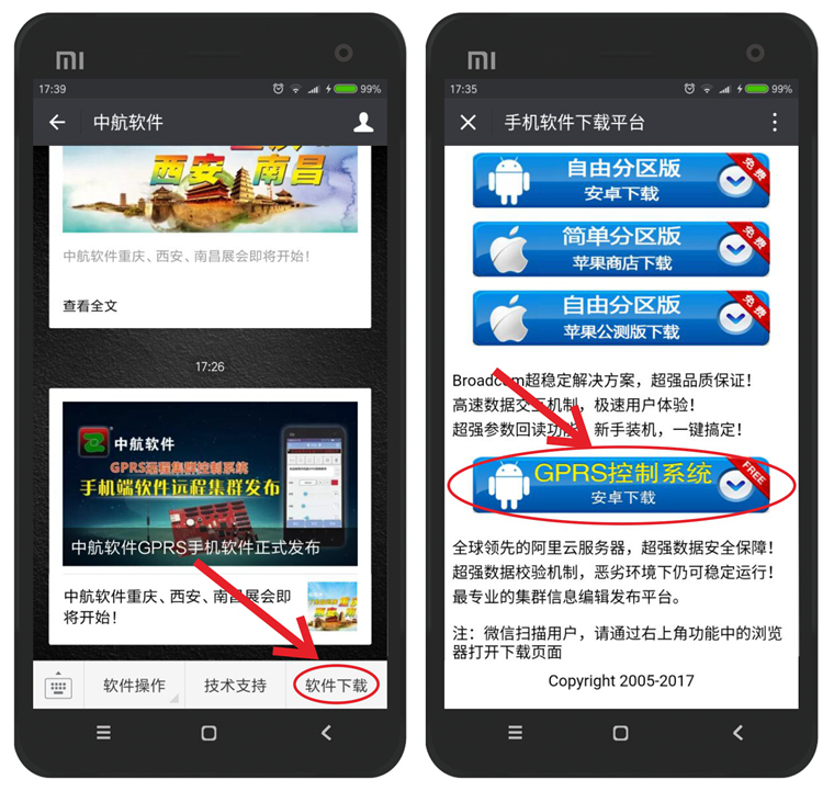 第1種方法:進(jìn)入中航軟件微信公眾平臺,點擊右下角“軟件下載”--點擊“GPRS控制系統(tǒng)安卓下載”按鈕。使用瀏覽器打開,點擊下載,安裝完畢即可使用。