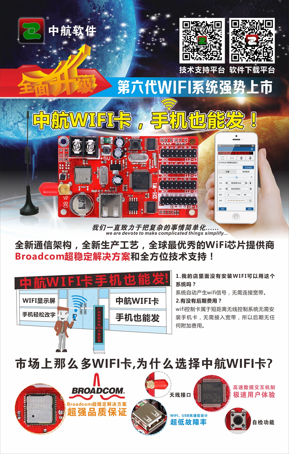 廣告機(jī)和Wi-Fi控制卡更配哦,中航軟件第六代WiFi系統(tǒng),全新通信架構(gòu),全新生產(chǎn)工藝,全球最優(yōu)秀的WiFi芯片提供商Broadcom超穩(wěn)定解決方案和全方位技術(shù)支持!為您做最好廣告機(jī)保駕護(hù)航!