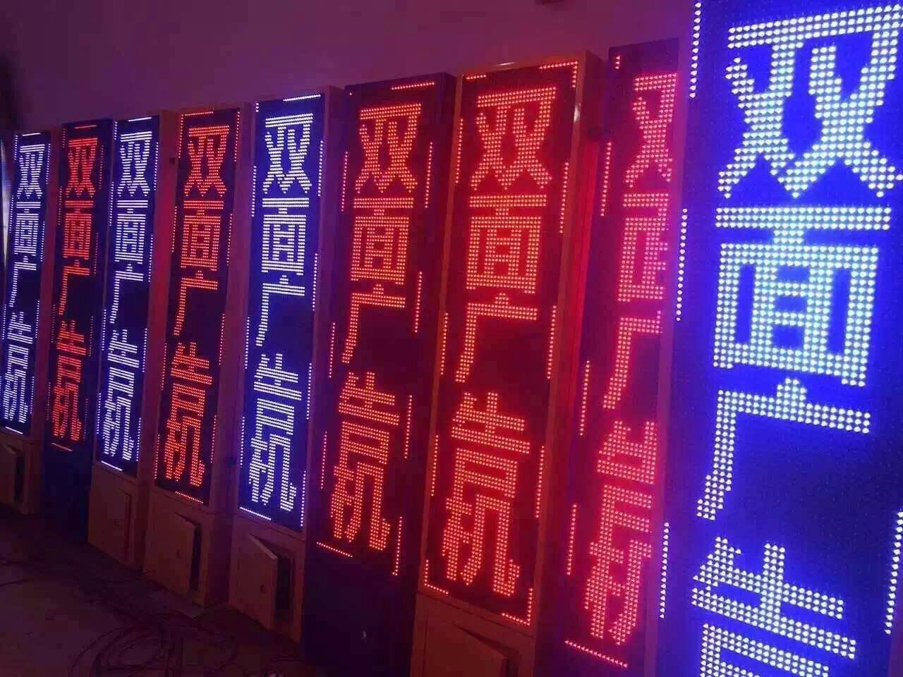 一般市面上采用P10單元板,外框材質(zhì)多采用冷軋板高溫烤漆,發(fā)光顏色可定制紅綠黃白藍(lán)紫等,前后雙面獨(dú)立顯示廣告。優(yōu)點(diǎn):攜帶、移動(dòng)方便,手機(jī)操作極其方便。可廣泛用于小商品城、電子城、擺攤、臨街商鋪等廣告促銷。