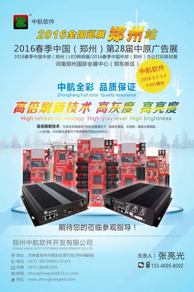 在接下來,中航軟件2016年全國巡展-鄭州站展覽會上,中航軟件將展示的產(chǎn)品系列有:全彩同步系列,全彩異步系列,門楣全彩,全面升級第六代WIFI系統(tǒng),GPRS系列等。誠邀您蒞臨中航展臺,把握中部崛起的時機(jī),乘坐中原交通網(wǎng)、陸上絲路,攜手鑄造2016年新輝煌!
