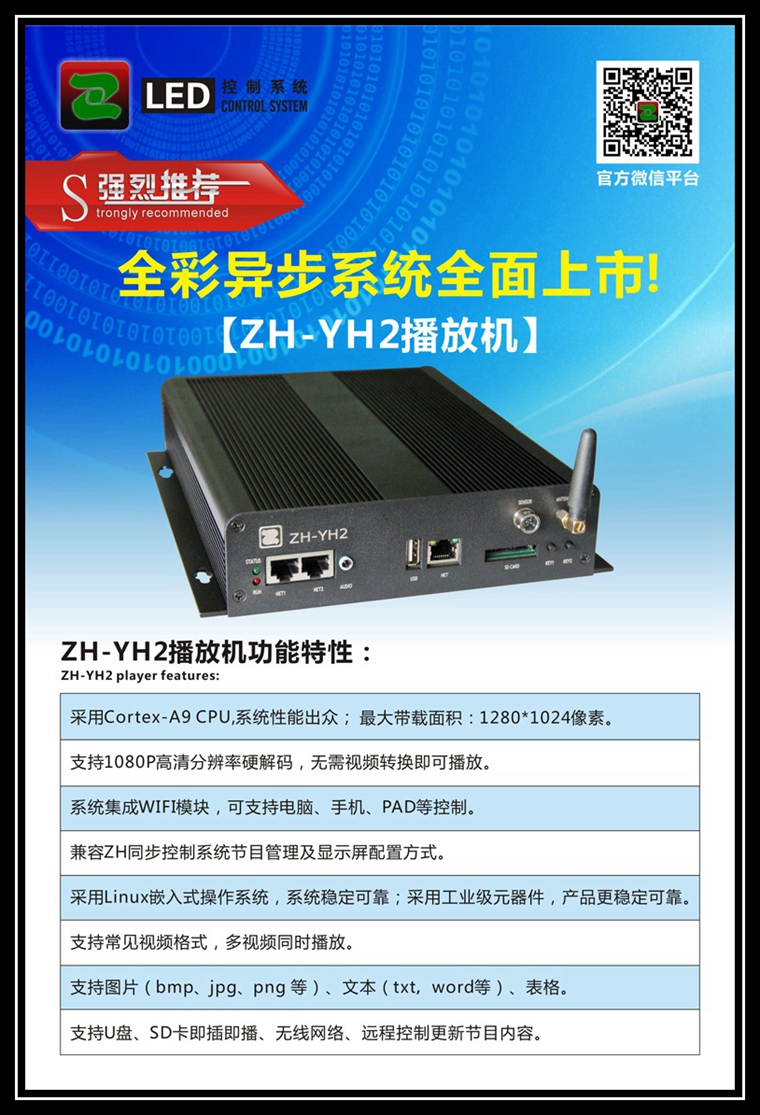 上海市共歡廣告P10門頭全彩768*80,1臺(tái)ZH-YH2播放盒(最大帶載1280*1024),3張ZH-CR75-12接收卡,中航異步全彩播放盒支持1080P高清解碼,無線WIFI,U盤,網(wǎng)線,SD卡等控制,播放流暢,無卡頓現(xiàn)象。做彩屏,用中航全彩系統(tǒng)!