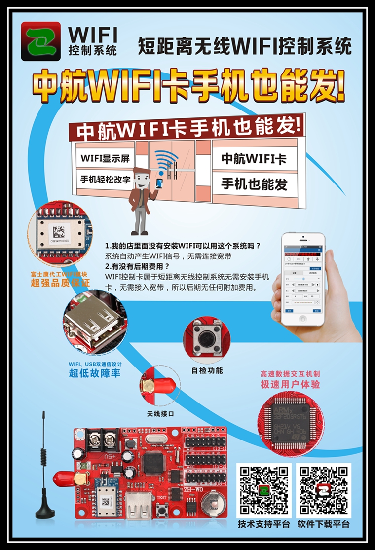 我公司推出V3版WiFi控制系統(tǒng),軟件操作簡(jiǎn)單好用,免布線、免U盤(pán)、無(wú)需連接寬帶,更無(wú)后期任何附加費(fèi)用,高質(zhì)量方案,更容易被行業(yè)人員所接受使用,我們相信中航無(wú)線WiFi控制系統(tǒng)正在創(chuàng)造另一個(gè)神話(huà)——無(wú)線WiFi控制卡取代U盤(pán)控制卡成為市場(chǎng)主流產(chǎn)品。