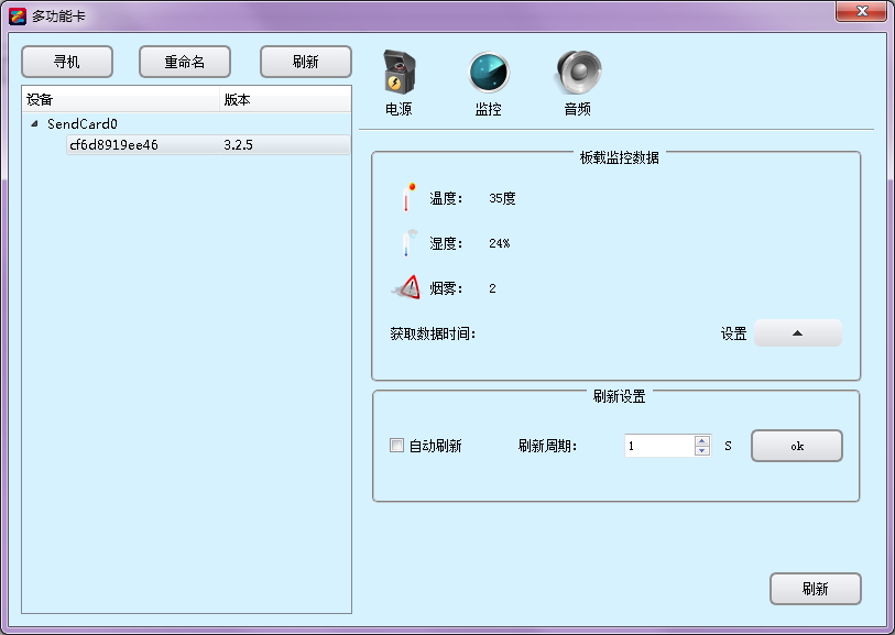 I、監(jiān)控功能:獲取環(huán)境溫度、濕度、煙霧參數(shù);設(shè)置刷新時間;設(shè)置觸發(fā)報警;報警恢復(fù);聯(lián)鎖電源開關(guān)。