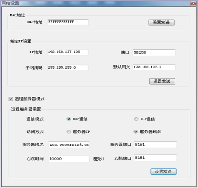 遠程服務器設置:可以選擇IP或者域名;公司搭建的云服務器一律設置域名,且服務器端口、心跳時間也不可改變;用戶搭建的服務器建議使用IP,端口可改變。